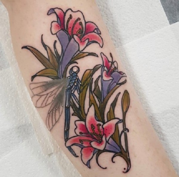 纹在手臂胳膊上的黑灰素花花卉纹身图案欣赏