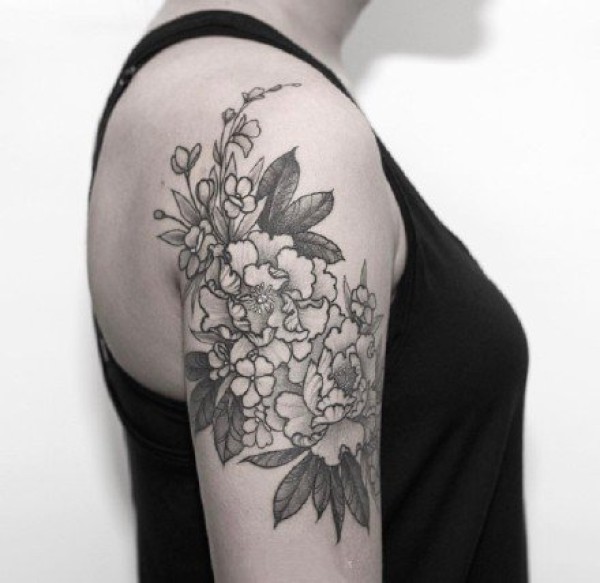 肩花纹身--一组适合肩部的黑灰肩花纹身图案欣赏
