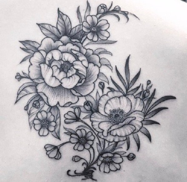 新传统花朵纹身:黑灰新传统风格的素花花卉纹身图案