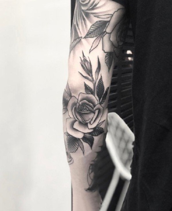 纹在手臂胳膊上的黑灰素花花卉纹身图案欣赏