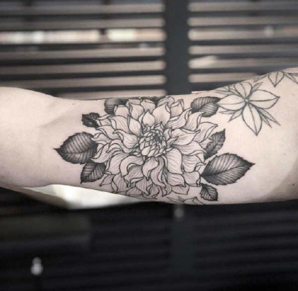 纹在手臂胳膊上的黑灰素花花卉纹身图案欣赏
