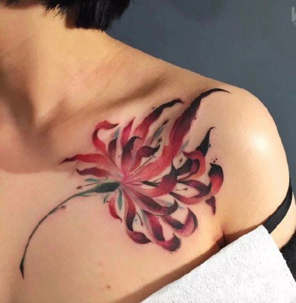 锁骨处美丽而骄傲的彼岸花纹身图案