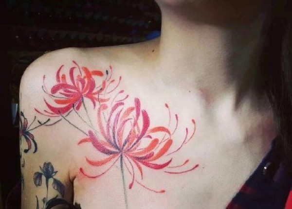 锁骨处美丽而骄傲的彼岸花纹身图案