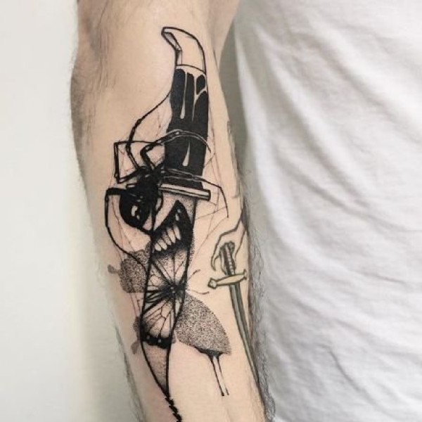 插入匕首的手和蜘蛛网上的骷髅头纹身