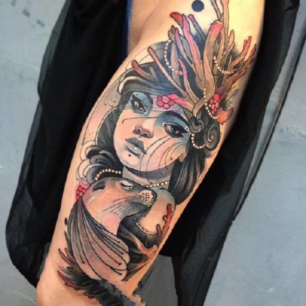 手臂女郎纹身:9张大臂和腿部的一组彩色女郎纹身图案