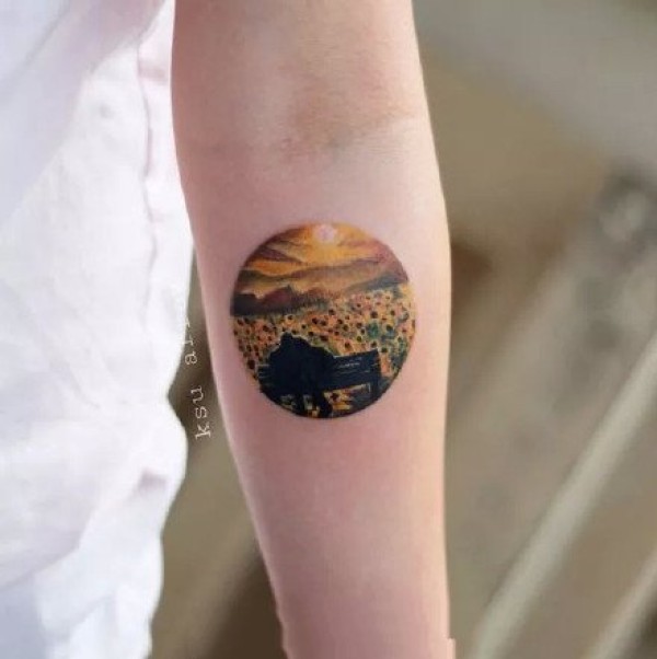 圆形风景纹身 小臂上的一组圆图形里的小风景纹身图案