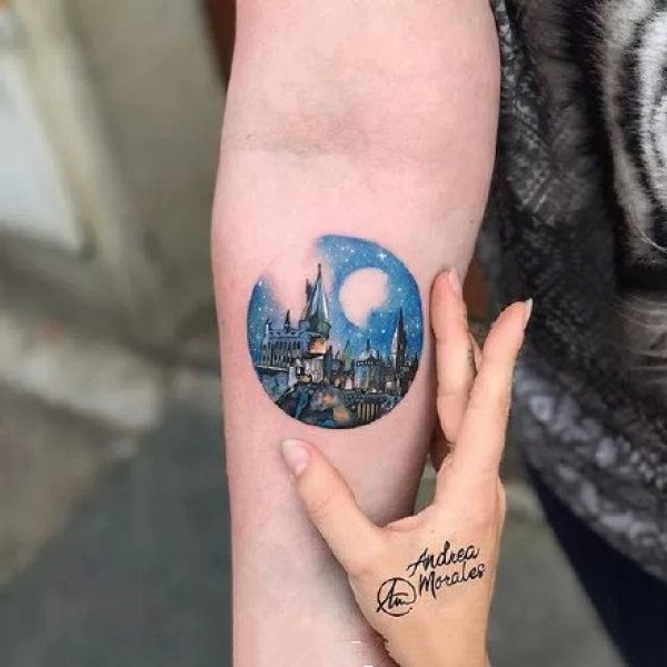 圆形风景纹身 小臂上的一组圆图形里的小风景纹身图案