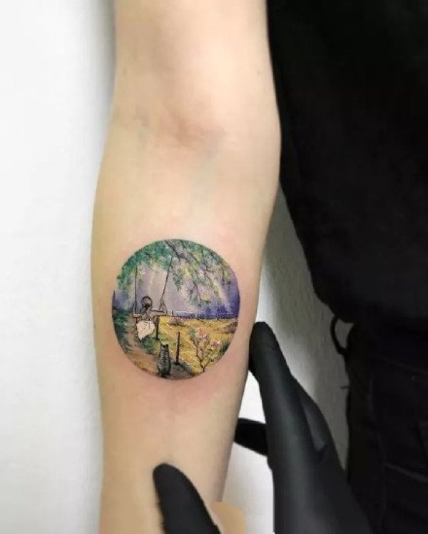 圆形风景纹身 小臂上的一组圆图形里的小风景纹身图案