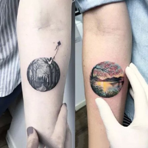 圆形风景纹身 小臂上的一组圆图形里的小风景纹身图案