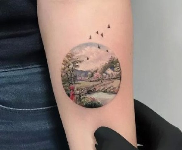 圆形风景纹身 小臂上的一组圆图形里的小风景纹身图案