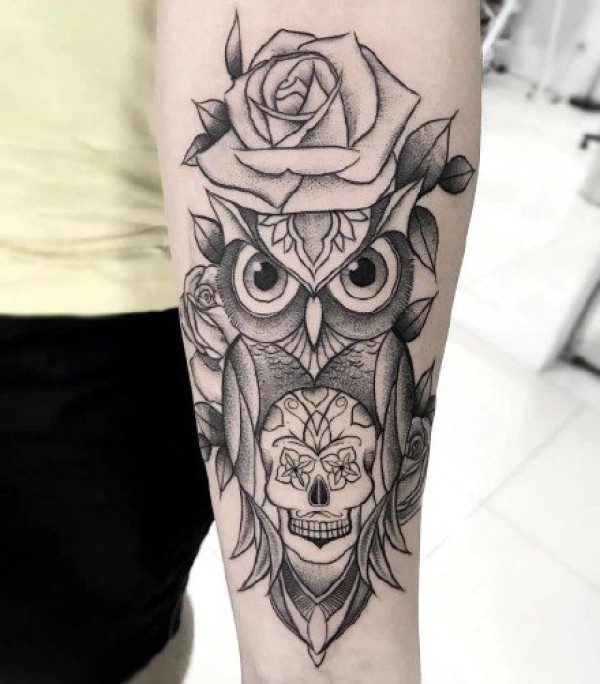 个性猫头鹰纹身:黑灰风格的一组猫头鹰纹身图案作品