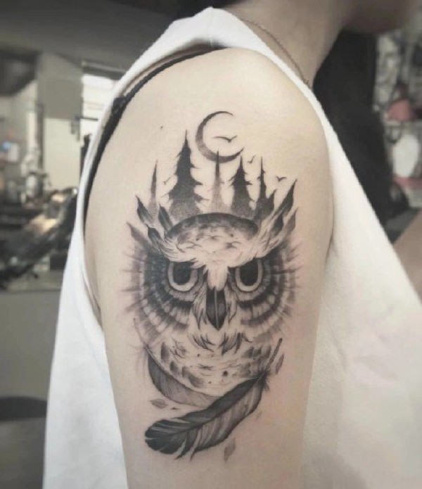个性猫头鹰纹身:黑灰风格的一组猫头鹰纹身图案作品