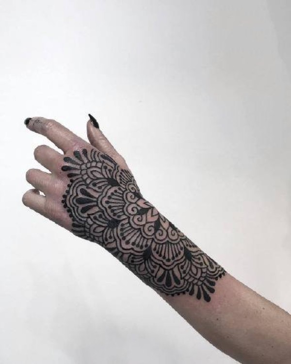 手背到小臂上的黑色点刺梵花纹身图案9张