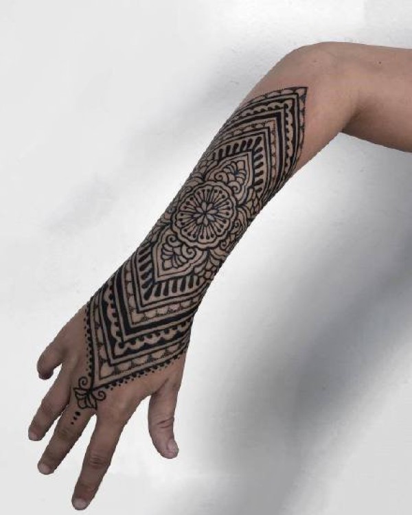 手背到小臂上的黑色点刺梵花纹身图案9张