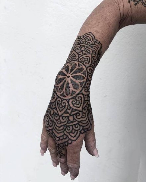 手背到小臂上的黑色点刺梵花纹身图案9张