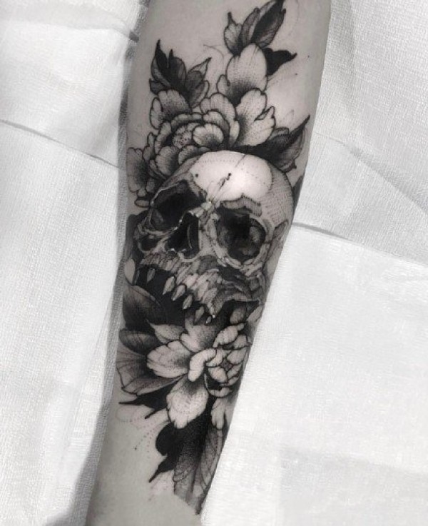 黑灰色玫瑰花和骷髅头纹身图片手稿
