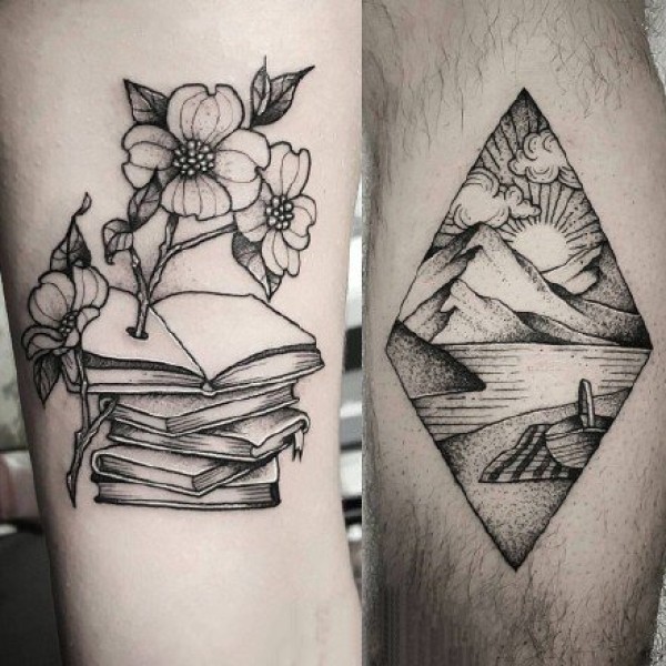 点刺黑灰风格的一组点刺和线条组合的黑灰纹身图案