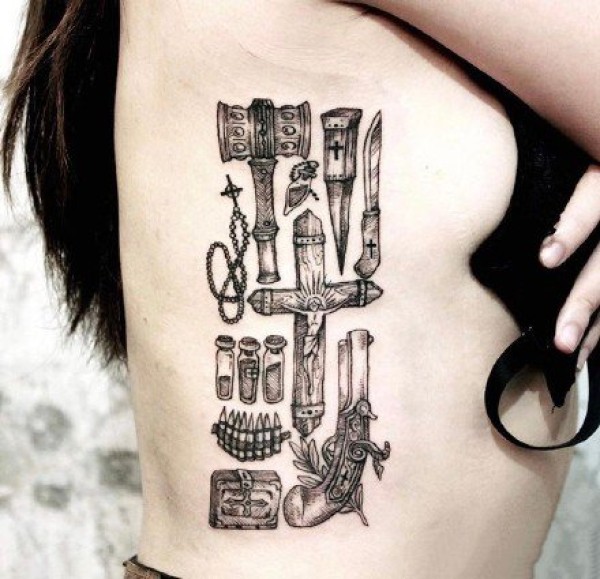 男子右侧肋上的弯月挂着吊坠十字架纹身图片