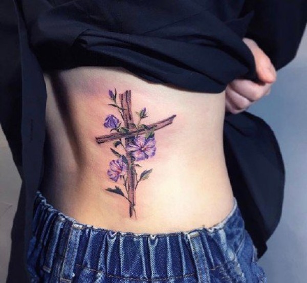 男子右侧肋上的弯月挂着吊坠十字架纹身图片