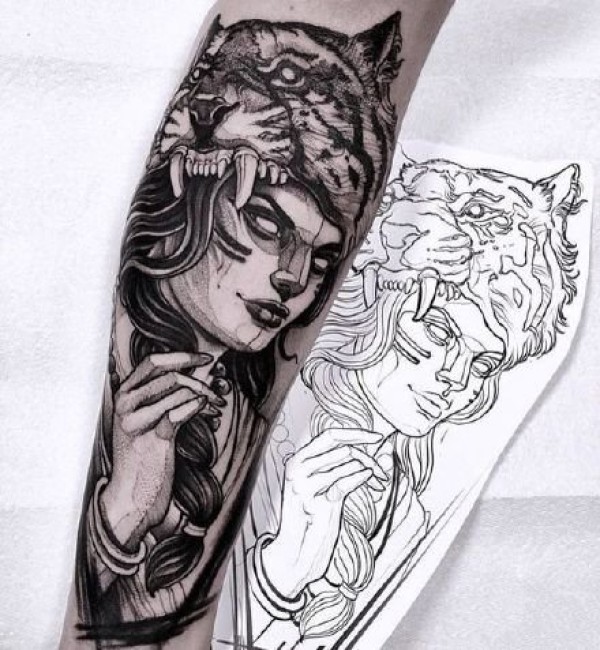 手臂上线条感很不错的黑灰欧美人像纹身图案