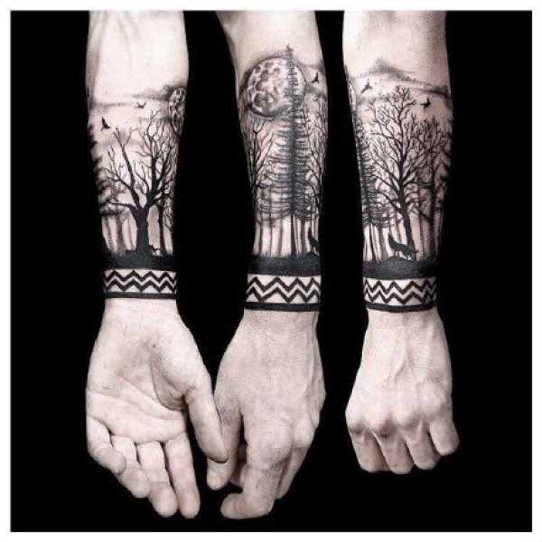 环绕在手臂上的森林树木等臂环手环纹身图案