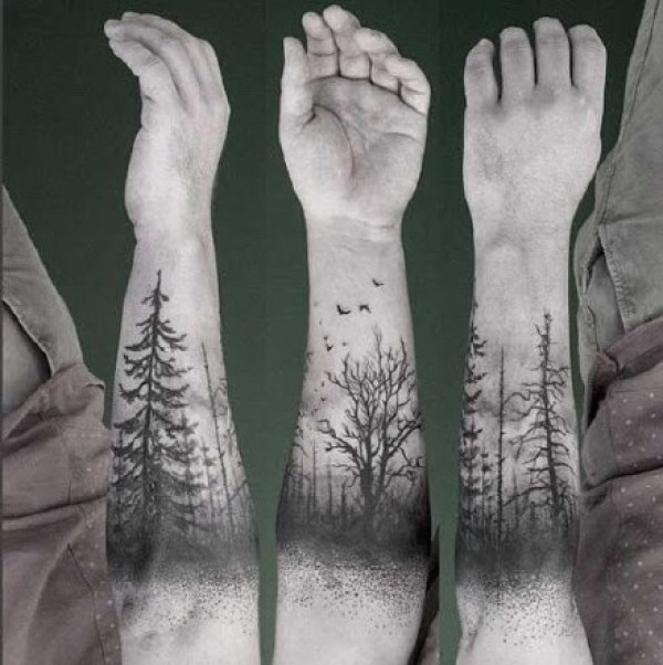 森林树木纹身图案_一组手臂上黑灰树木森林纹身图案作品