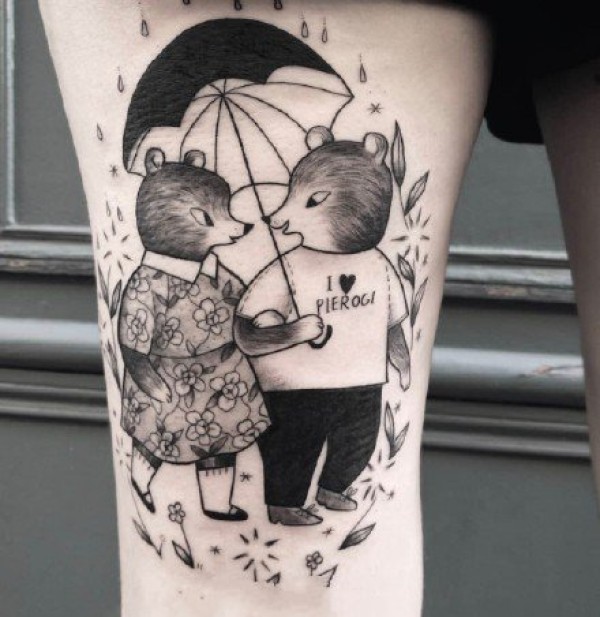 可爱的一组黑灰童趣动物单线纹身作品图案