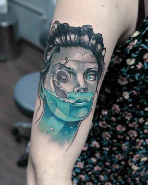 手臂上线条感很不错的黑灰欧美人像纹身图案