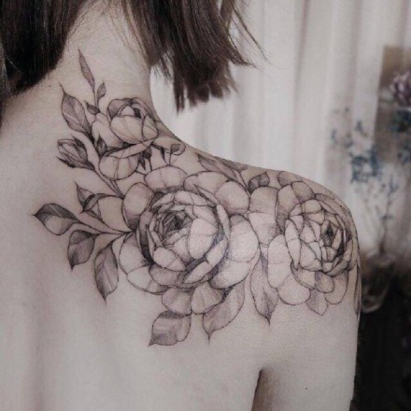 肩花纹身作品:女性肩部上的花卉性感纹身图案
