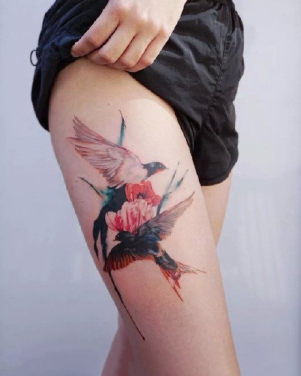 大腿上水墨中国画纹身图案