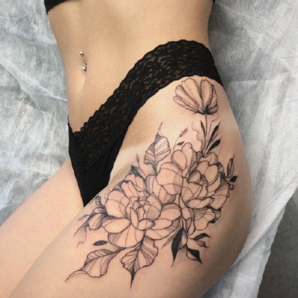 性感花朵纹身--女性大腿侧部性感的花朵纹身