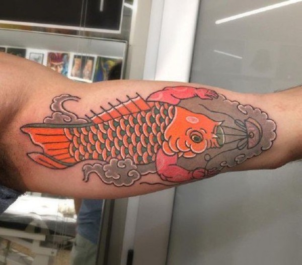 蝙蝠,幼狮,鲤鱼组成的花臂纹身
