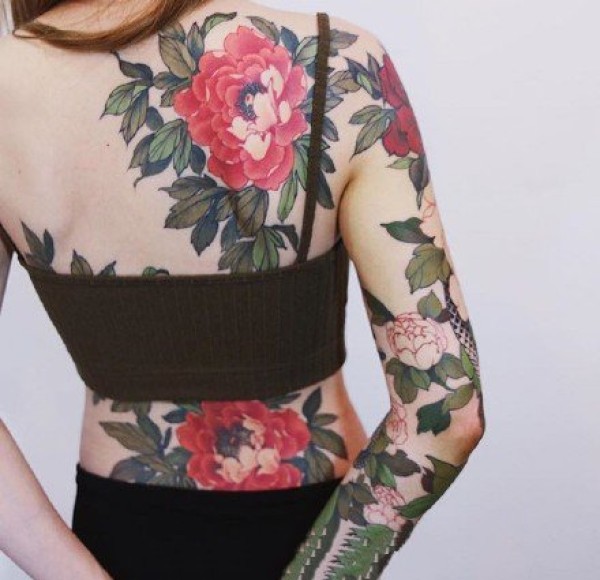 适合女性的一组炫彩牡丹纹身图案9张
