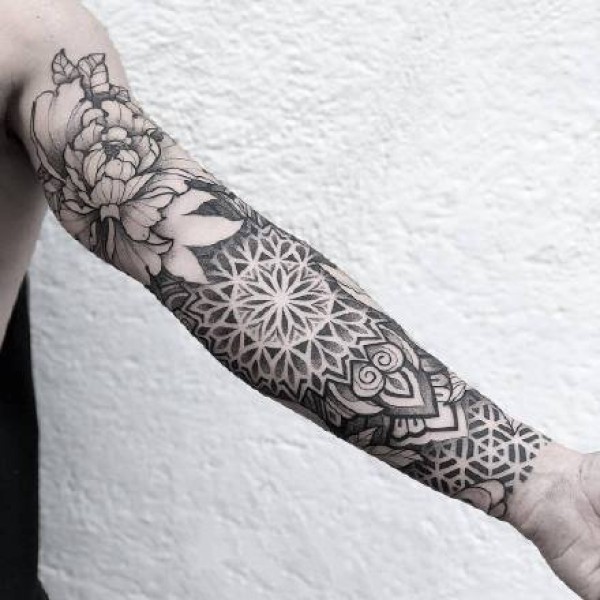 繁花花臂纹身:一组黑灰点刺繁花图腾纹身花臂作品欣赏