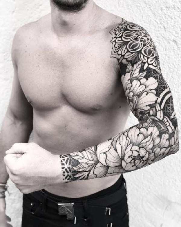 繁花花臂纹身:一组黑灰点刺繁花图腾纹身花臂作品欣赏