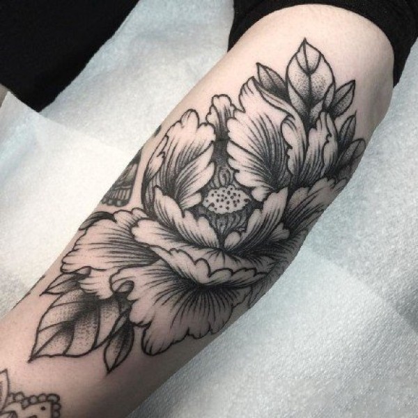 纹在手臂胳膊上的黑灰素花花卉纹身图案欣赏