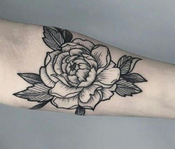 纹在手臂胳膊上的黑灰素花花卉纹身图案欣赏