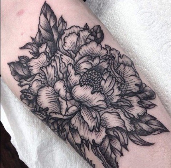 纹在手臂胳膊上的黑灰素花花卉纹身图案欣赏