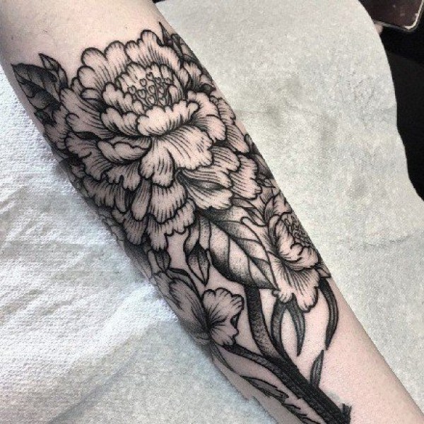 纹在手臂胳膊上的黑灰素花花卉纹身图案欣赏