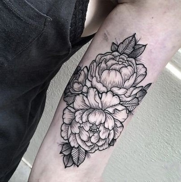 纹在手臂胳膊上的黑灰素花花卉纹身图案欣赏