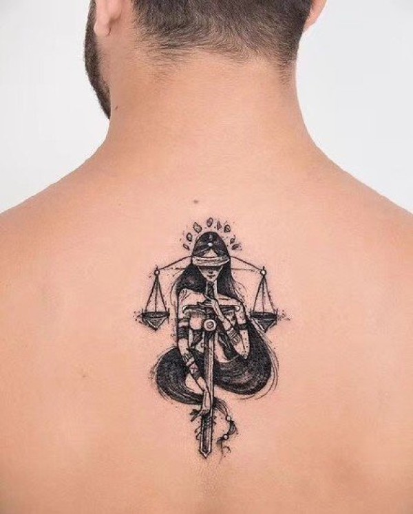 男生耳后黑色简单个性线条天秤座星座符号纹身图片