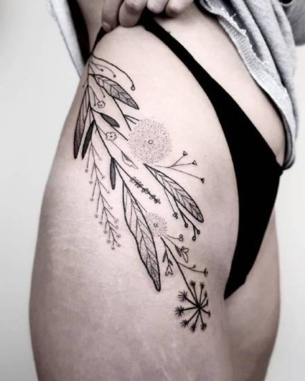 枝桠纹身:黑灰色的花草植物枝条纹身图案9张