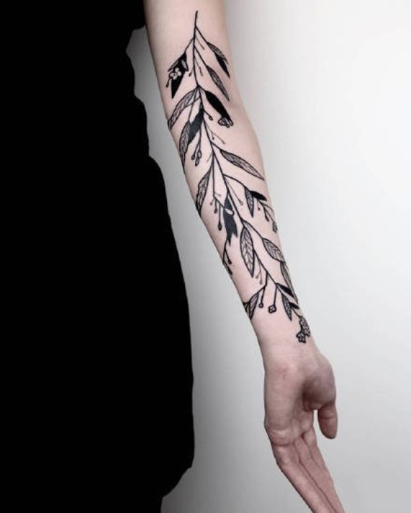 枝桠纹身:黑灰色的花草植物枝条纹身图案9张