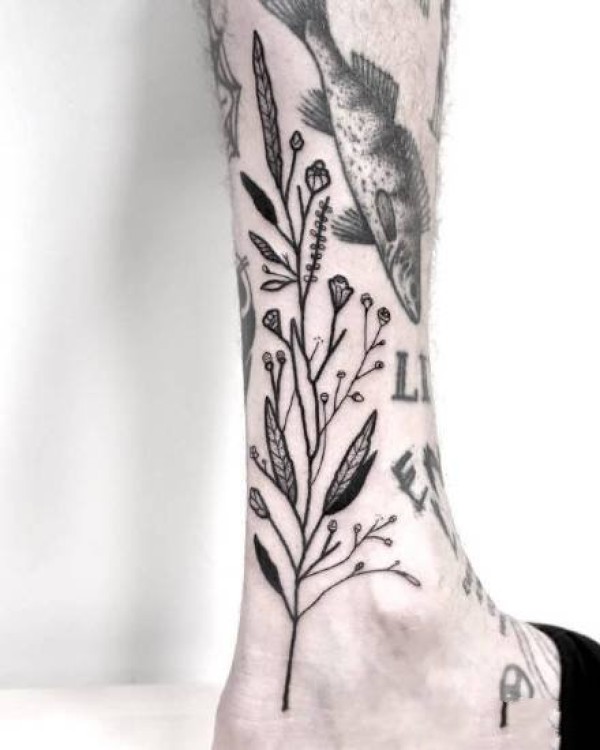 枝桠纹身:黑灰色的花草植物枝条纹身图案9张