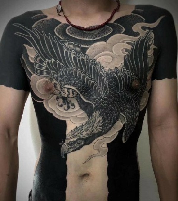 新传统风格的9张男性黑灰大满背纹身图案图片