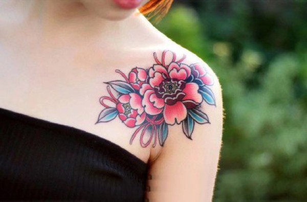 女性肩部刺青:一组纹在女性肩部的school纹身图案