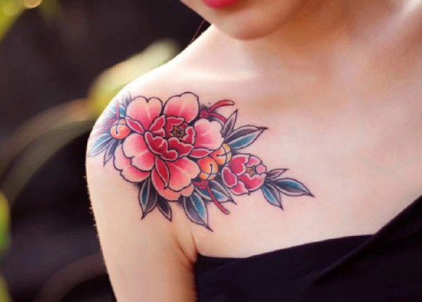 女性肩部刺青:一组纹在女性肩部的school纹身图案