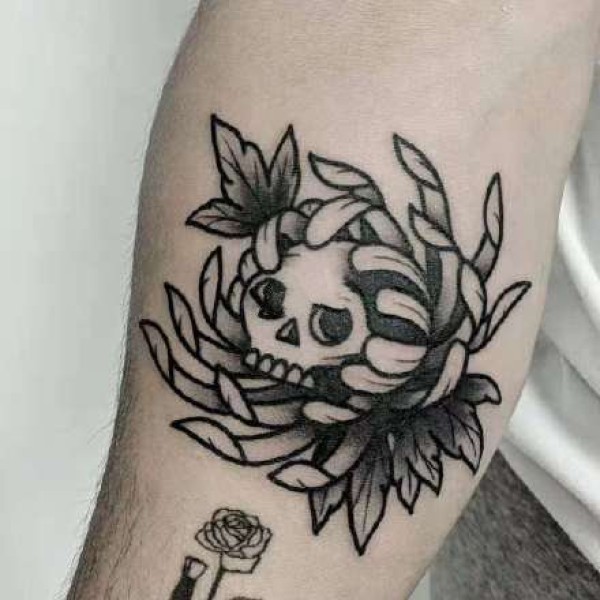 黑灰色玫瑰花和骷髅头纹身图片手稿