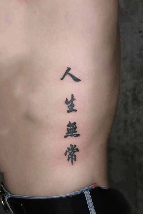 男生侧腰部的汉字等黑灰纹身作品