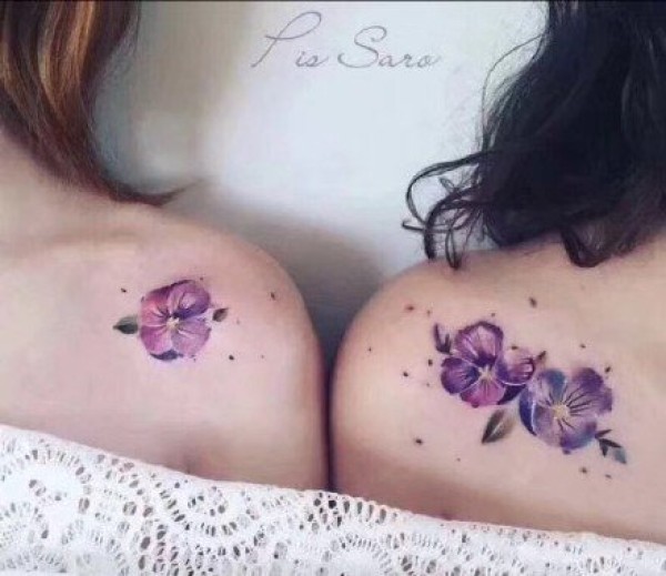女生肩部锁骨的小清新水彩花朵纹身图案